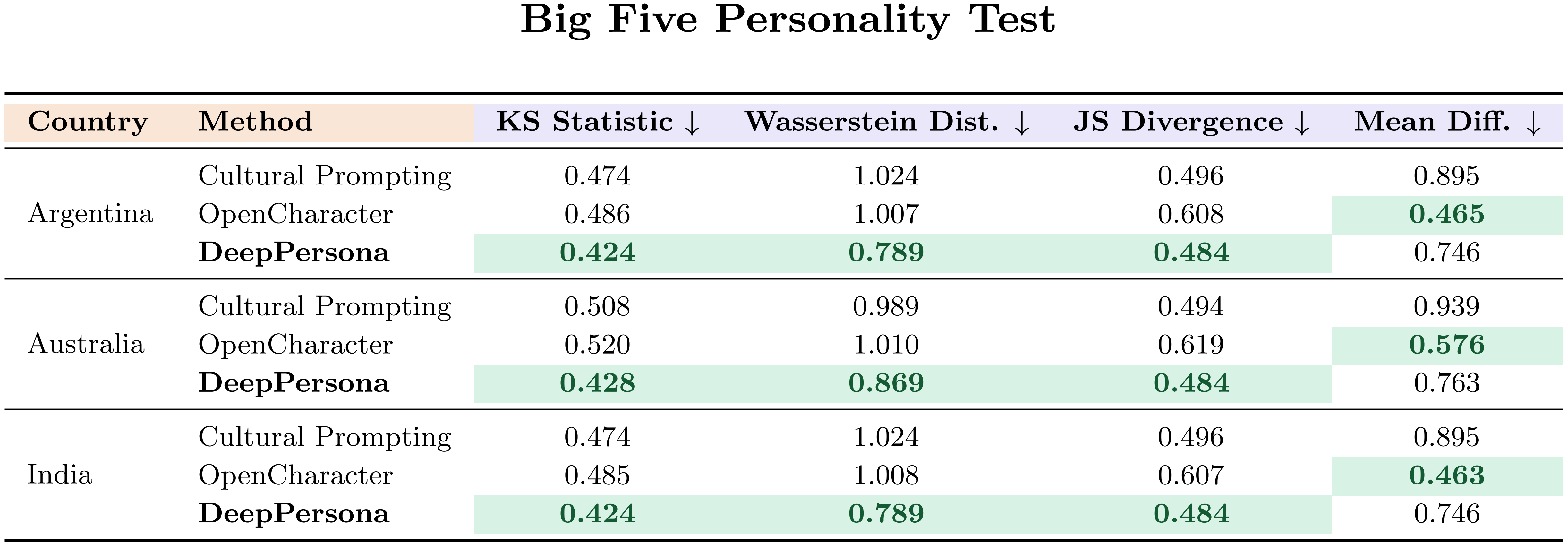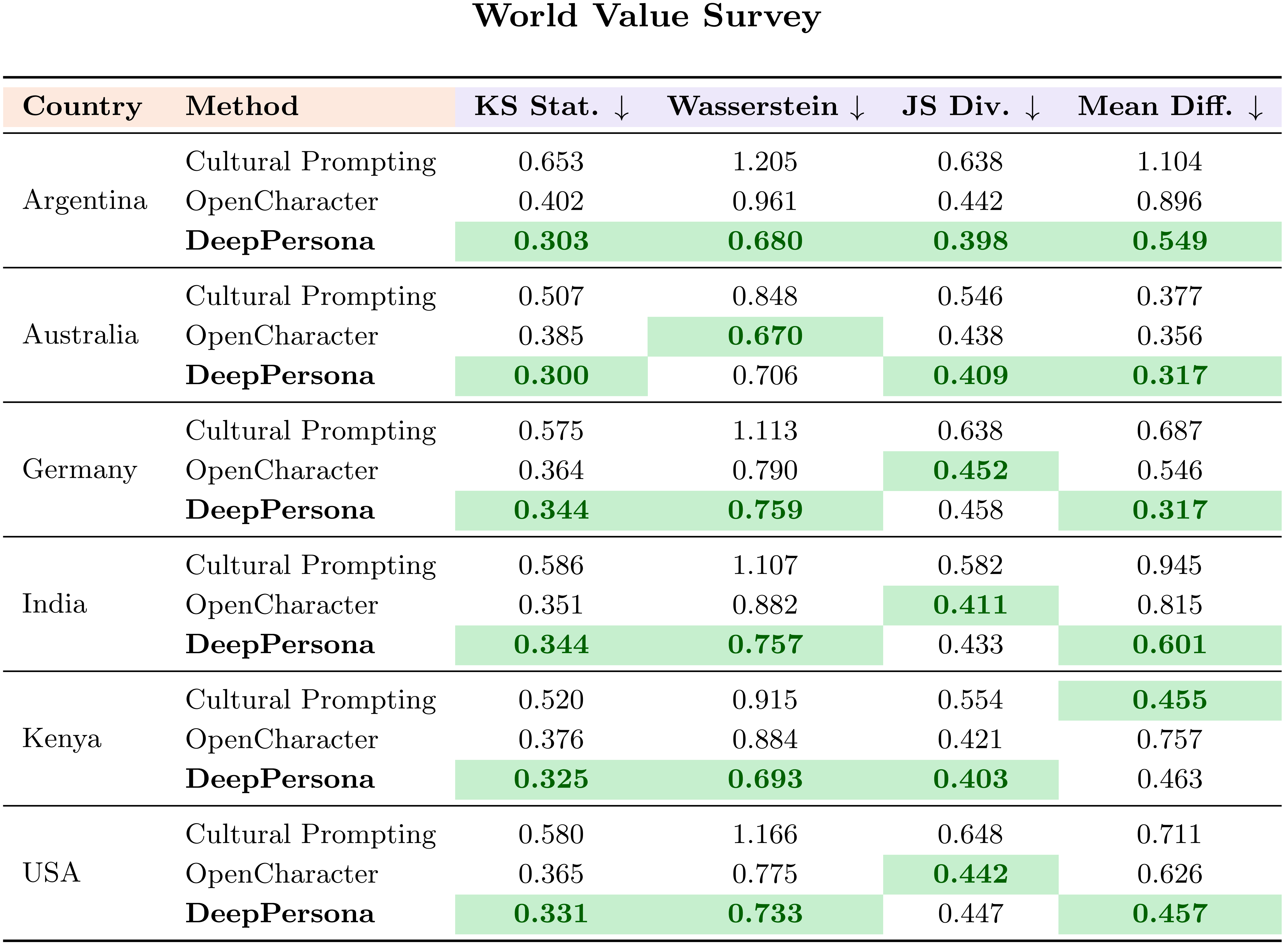 Result Figure 1. Comparison of DeepPersona with Cultural Prompting and OpenCharacter across six countries.Lower values on four statistical metrics (KS, Wasserstein, JS Divergence, Mean Diff.) indicate closer alignment with real human survey responses.DeepPersona consistently achieves the lowest distances (highlighted in green), showing superior realism and cultural fidelity.