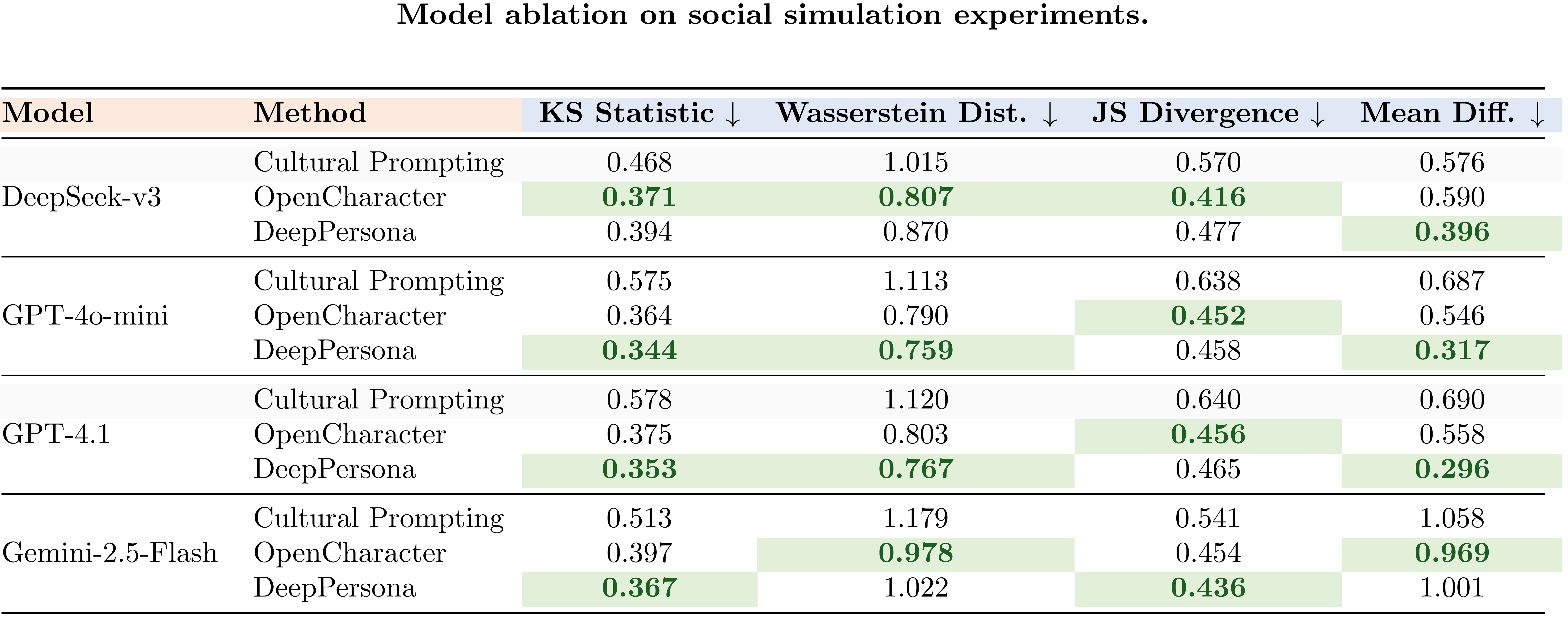 Result Figure 4. Comparison of persona modeling methods on World Values Survey responses from Germany. Lower scores across KS, Wasserstein, JS Divergence, and Mean Difference indicate better alignment with real human distributions. DeepPersona consistently achieves the lowest values across all backbone models (DeepSeek-v3, GPT-4o-mini, GPT-4.1, Gemini-2.5-Flash), confirming its robustness, generalizability, and superior fidelity in simulating authentic social behaviors.